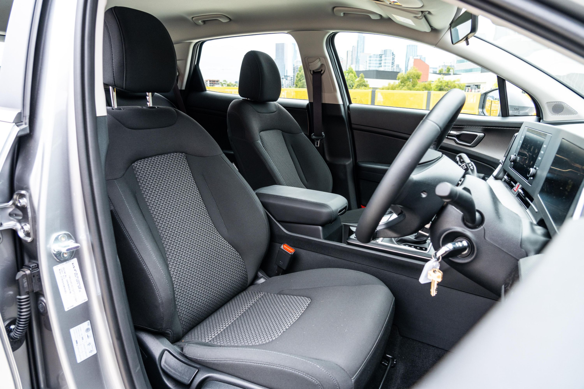 - Sportage SX+: 19-inch wheels, Harman Kardon audio, leatherette upholstery, keyless entry