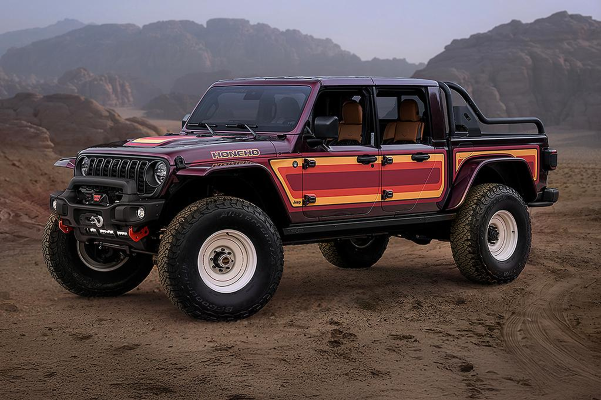 This concept reimagines the Gladiator as a two-door pickup with a massive six-foot bed. It began life as a dual cab but was chopped and stretched to make something entirely new. Custom touches include a sport bar, LED-heavy front bar, and spare wheel mount—all drenched in retro truck attitude.